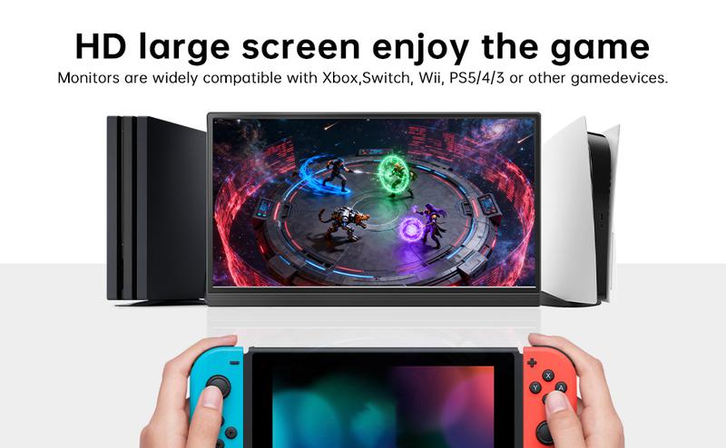 This portable monitor is perfect for various devices. Use it with your PC, MAC, phone, Xbox, or PS5-A1. The built-in kickstand allows for comfortable viewing. Connect via USB C or HDMI for seamless performance. Ideal for work, gaming, or entertainment.